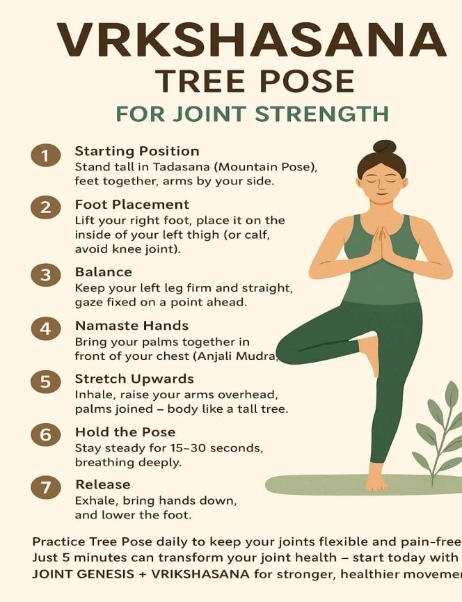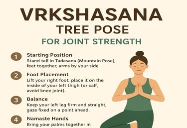"Tree Pose Improves balance, concentration, and stability,Strengthens legs, knees, and ankles,· Enhances posture and spinal alignment,Calms the mind and increases inner focus."Hold for 30–60 seconds on each leg ,Total time: 2–3 minutes.Morning after sunrise or evening before sunset